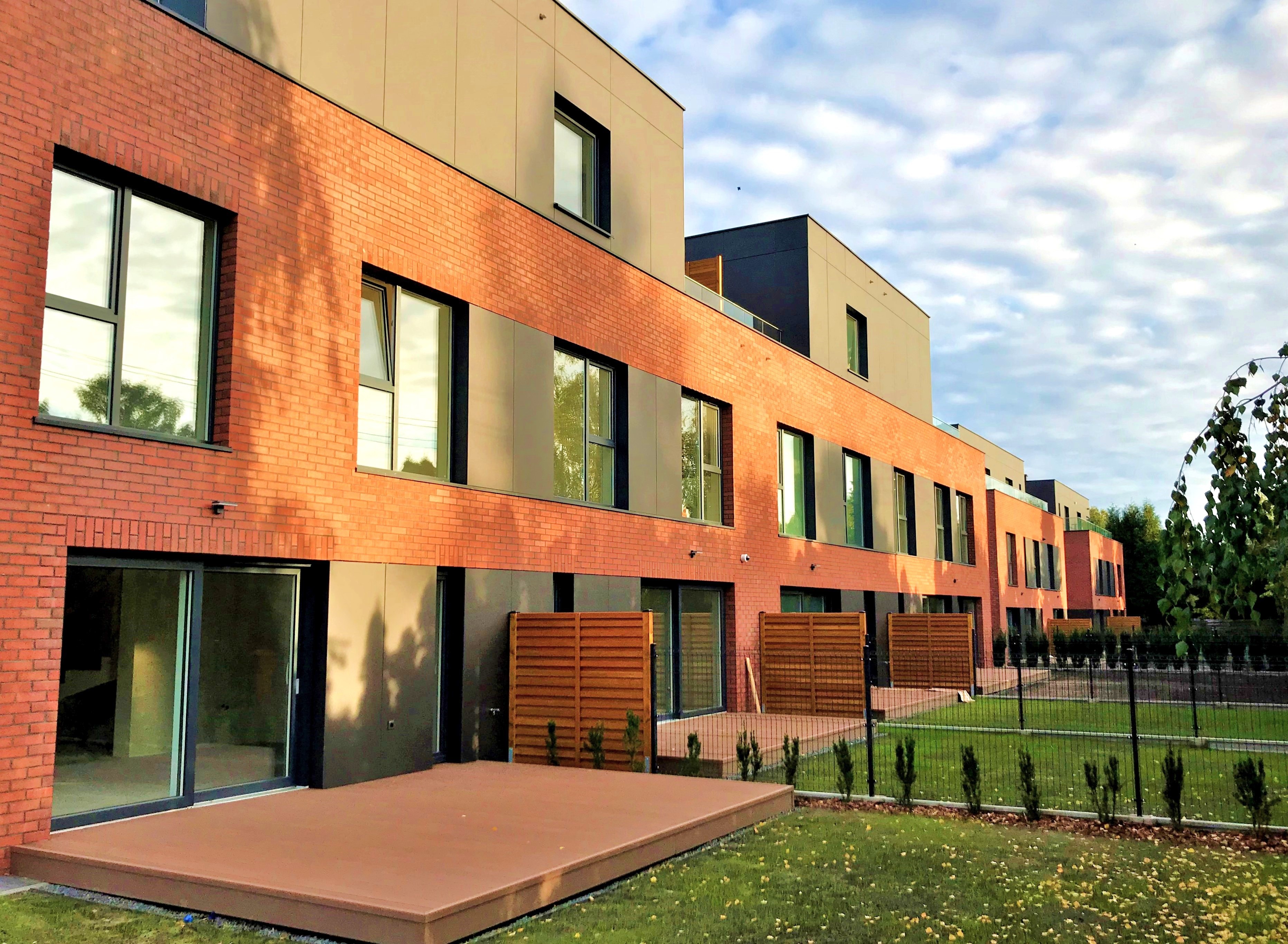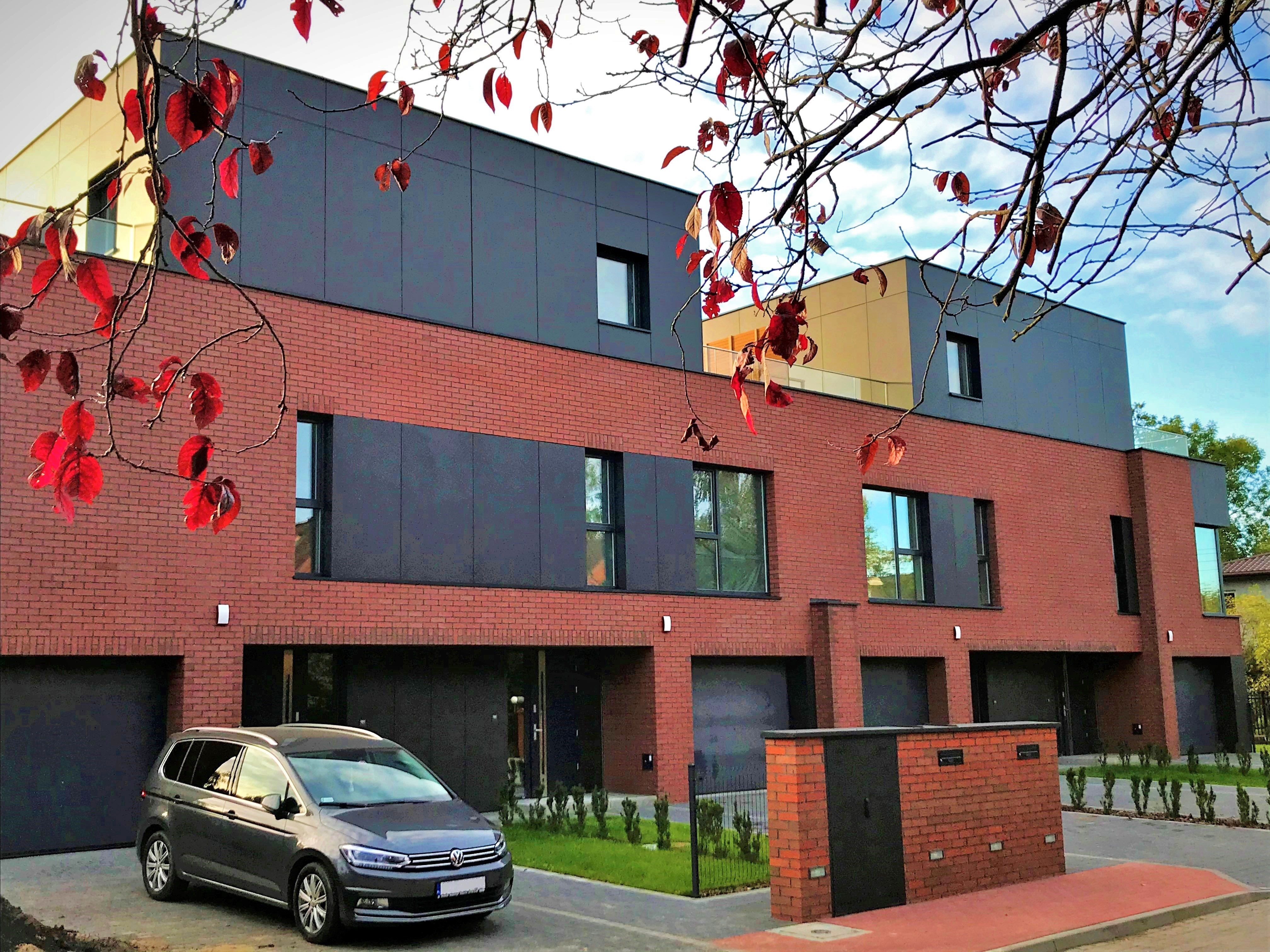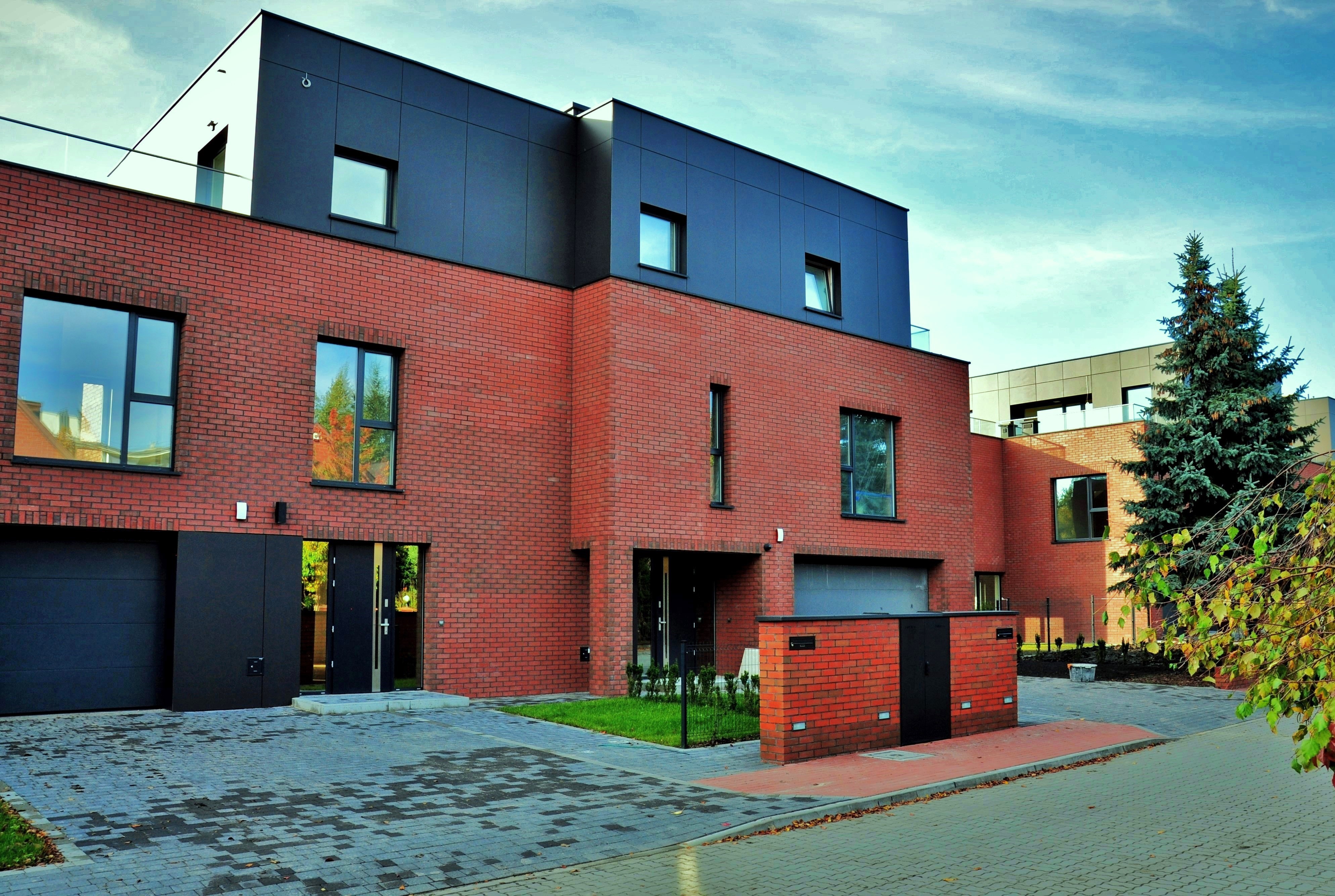 - Nowoczesna architektura ze szlachetnymi materiałami elewacyjnymi, takimi jak płytki klinkierowe oraz płyty cementowo-włóknowe