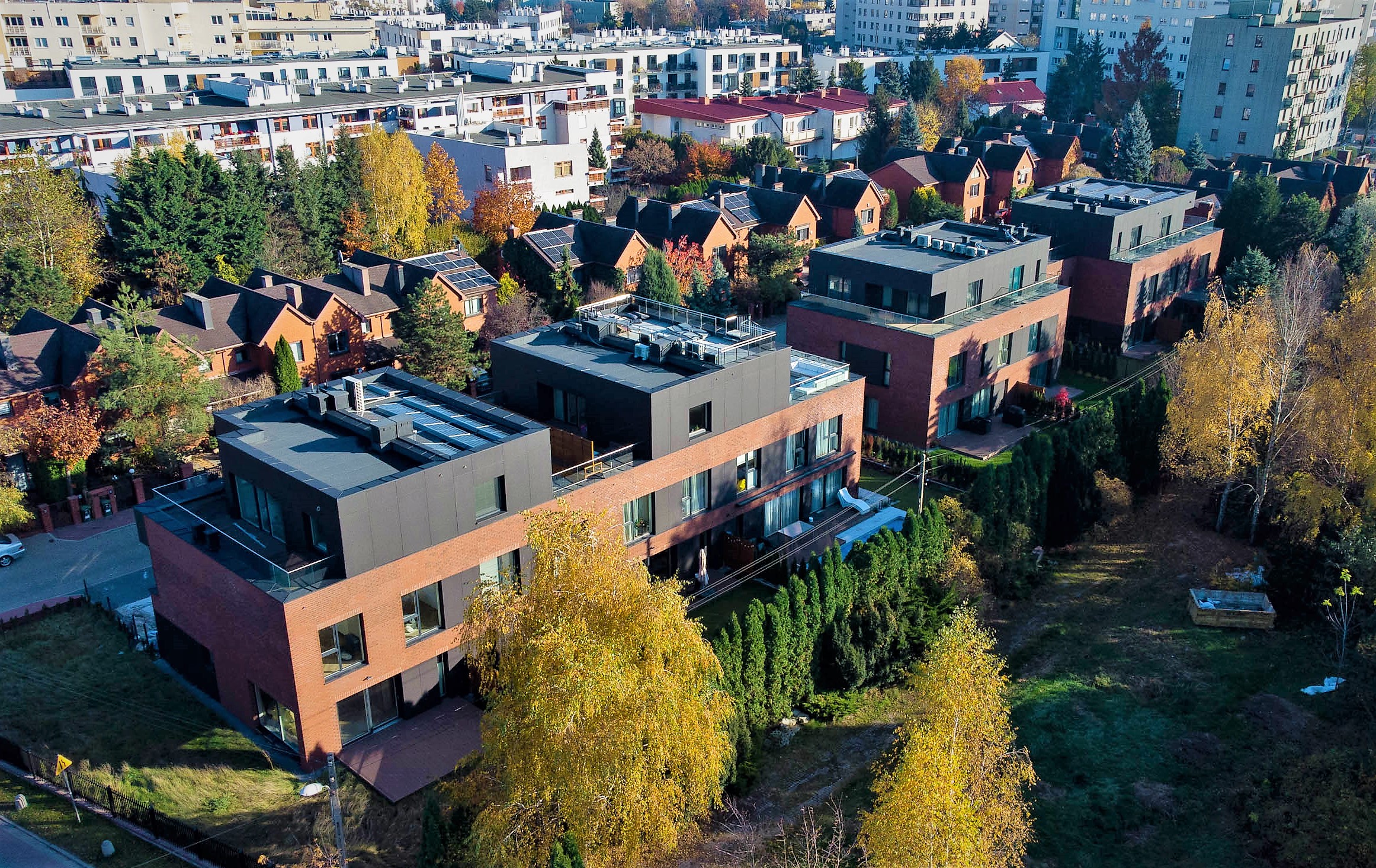 Budynki zostały wkomponowane w istniejące osiedle segmentów jednorodzinnych, nawiązując w nowoczesny lecz jednocześnie spójny sposób do sąsiadującej architektury zrealizowanej ok. 20 lat wcześniej. Oprócz zabudowy pustego dotychczas fragmentu osiedla o powierzchni ok. 2800 m2, dokonaliśmy również rewitalizacji szeregu części wspólnych (m.in. ogrodzenia, bram wjazdowych, chodników i drogi wewnętrznej), w trosce o komfort codziennego życia nie tylko dla naszych Klientów, ale również dla dotychczasowych mieszkańców.